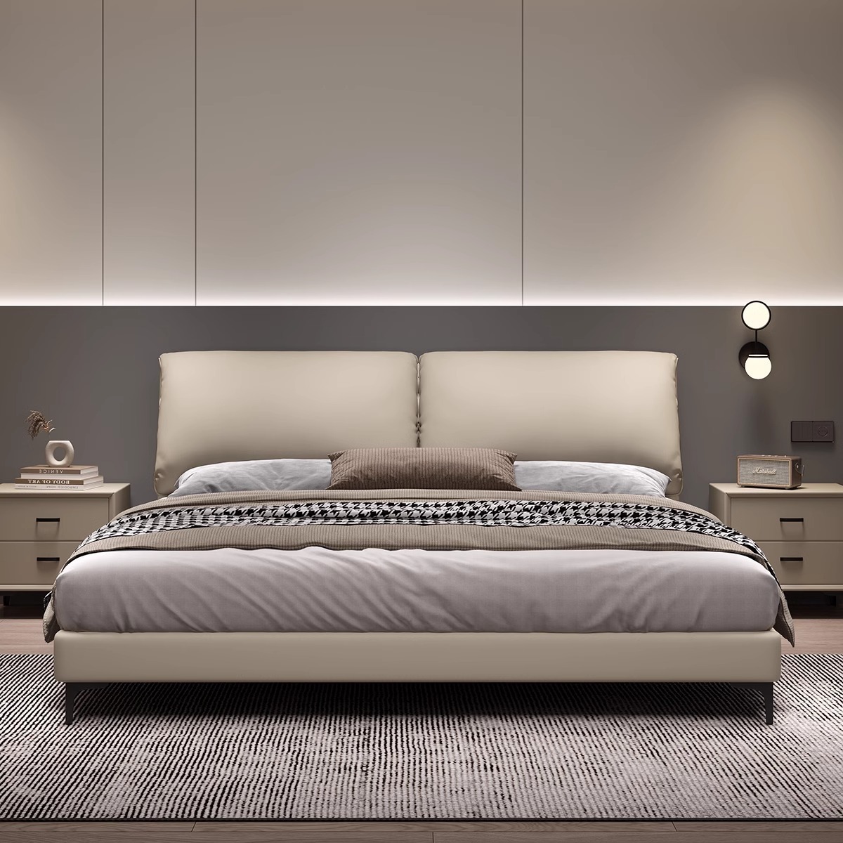 Wooden frame + sponge + faux leather + lamp | Bedroom use
